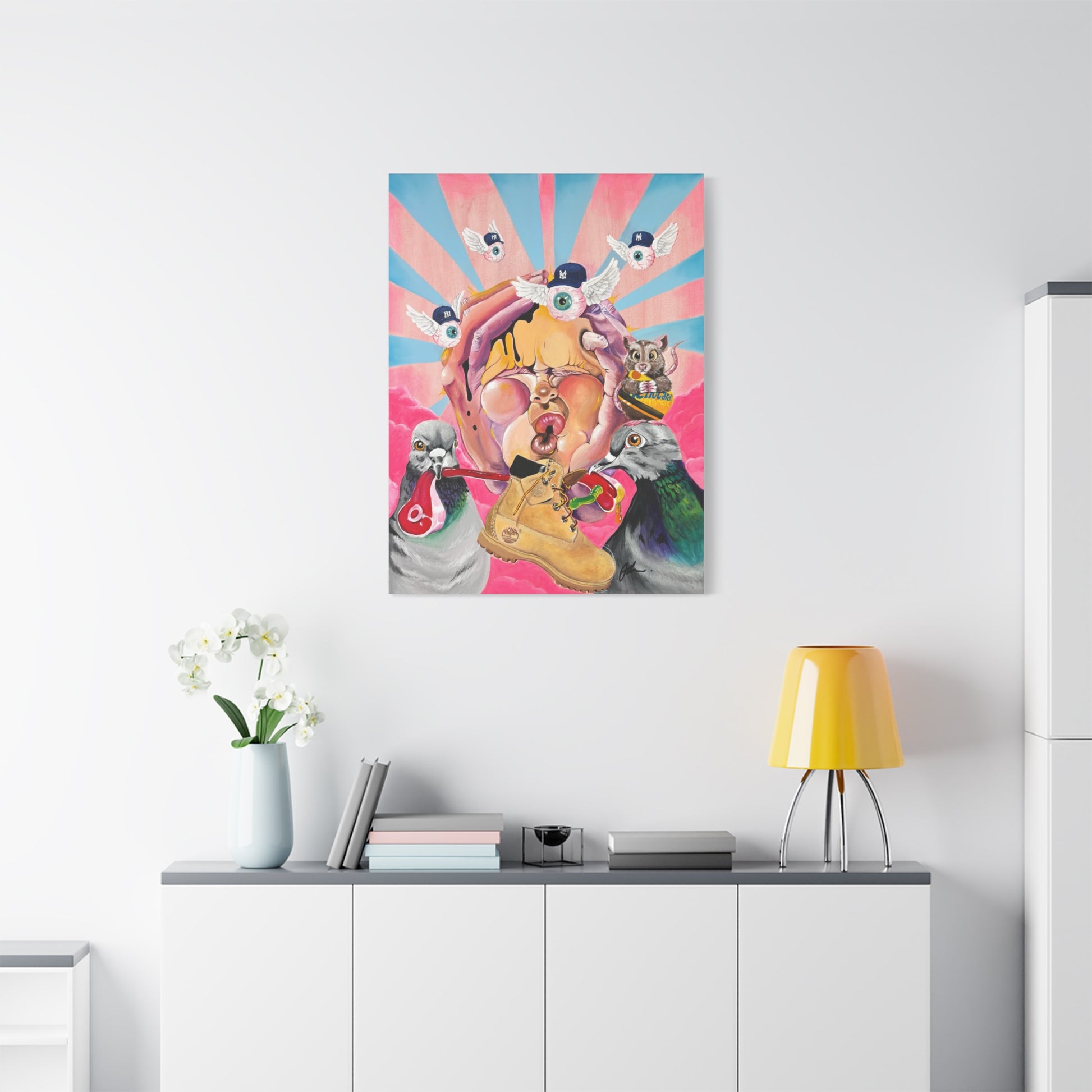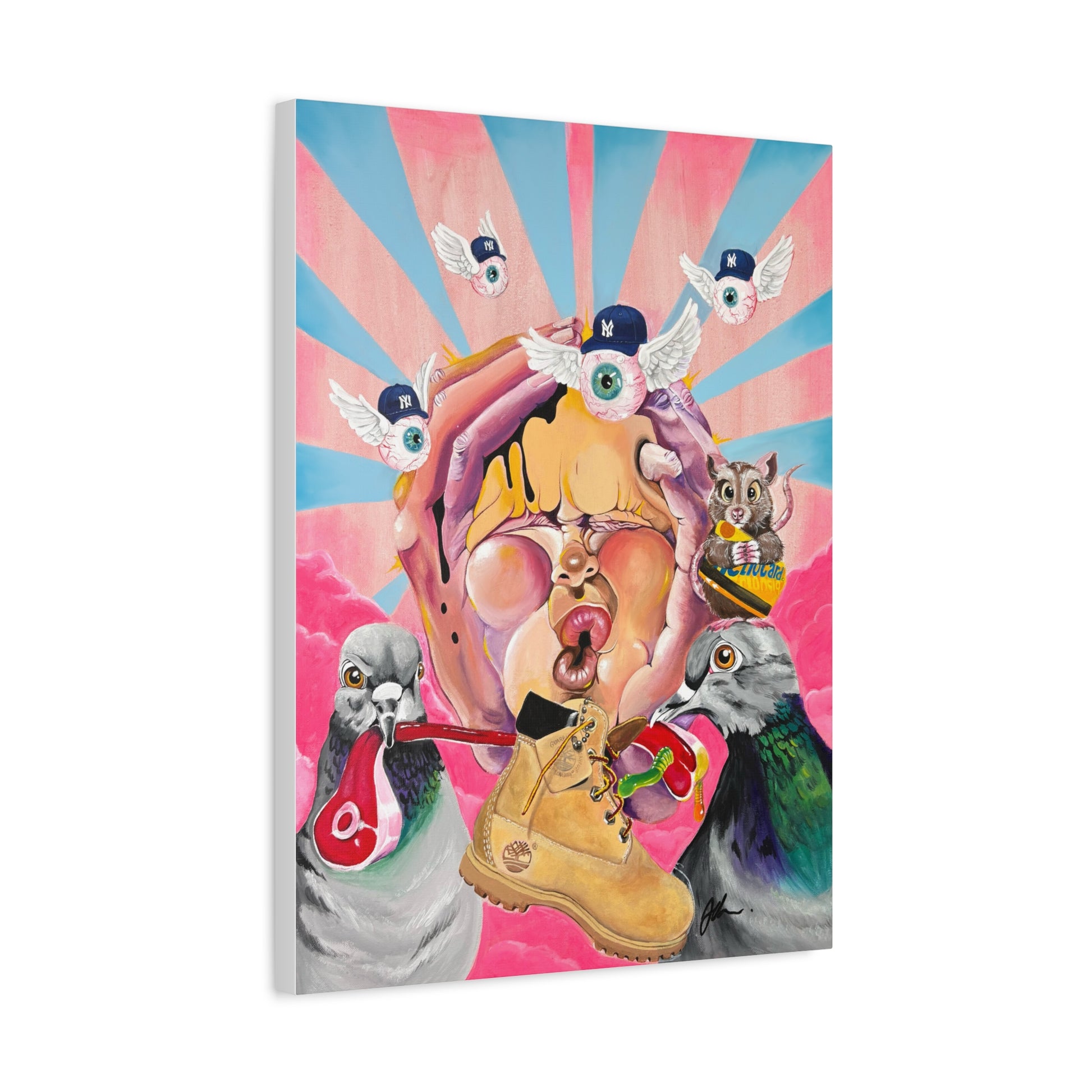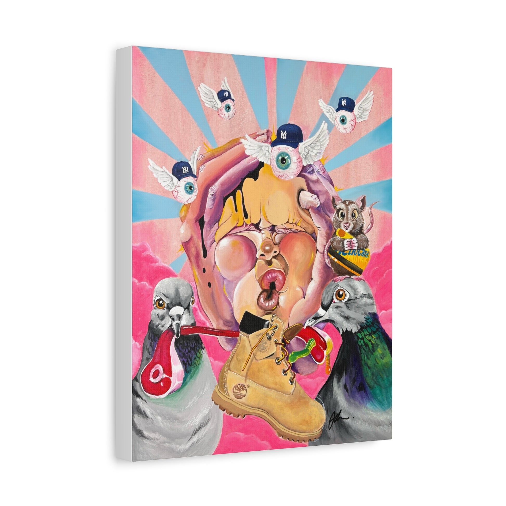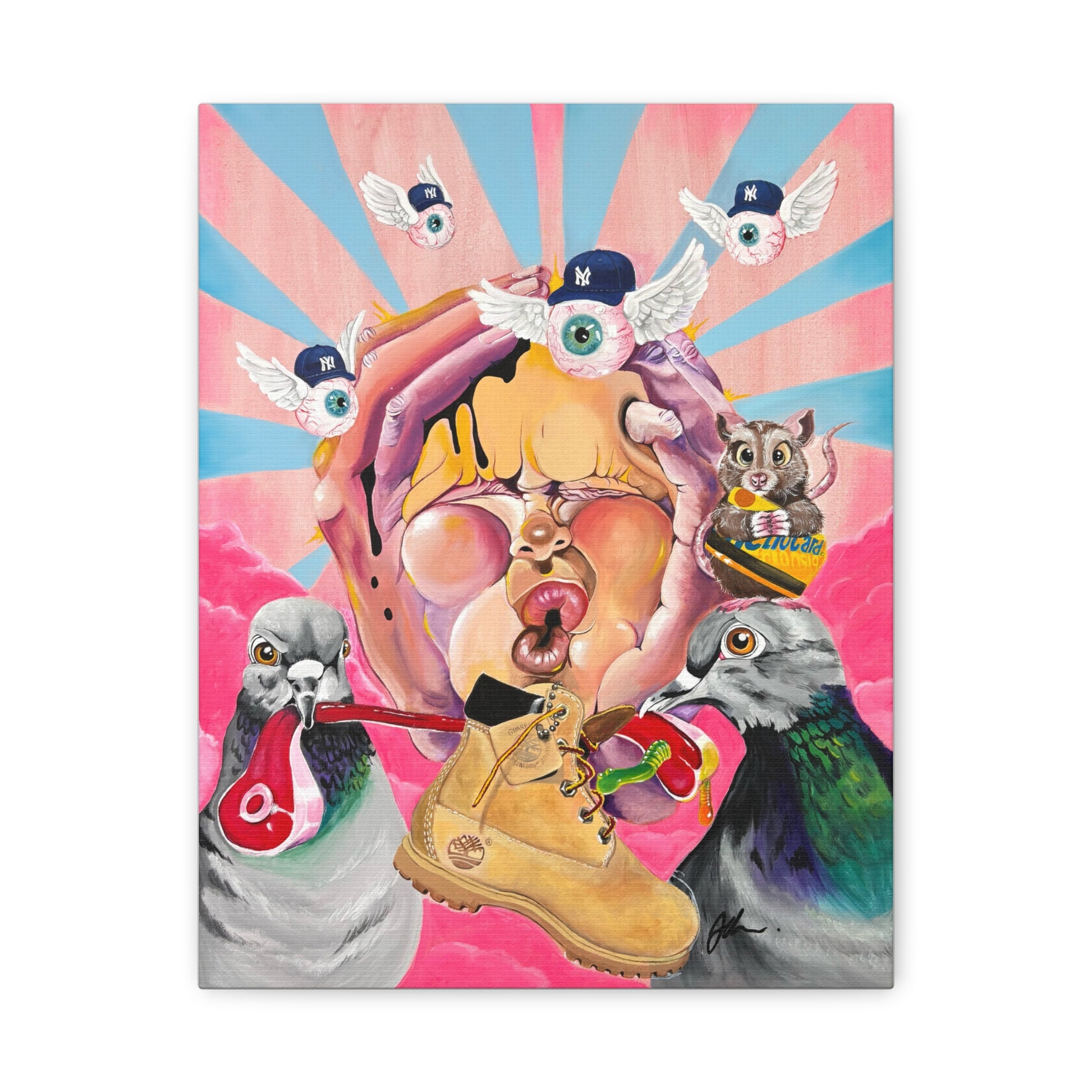 A surreal and satirical explosion of New York energy featuring the unofficial citizens of New York. This painting captures the essence of New York’s sun not the literal star in the sky, but the relentless, electric pulse that fuels its people, style, and chaos. A love letter to the wild heart of the city.